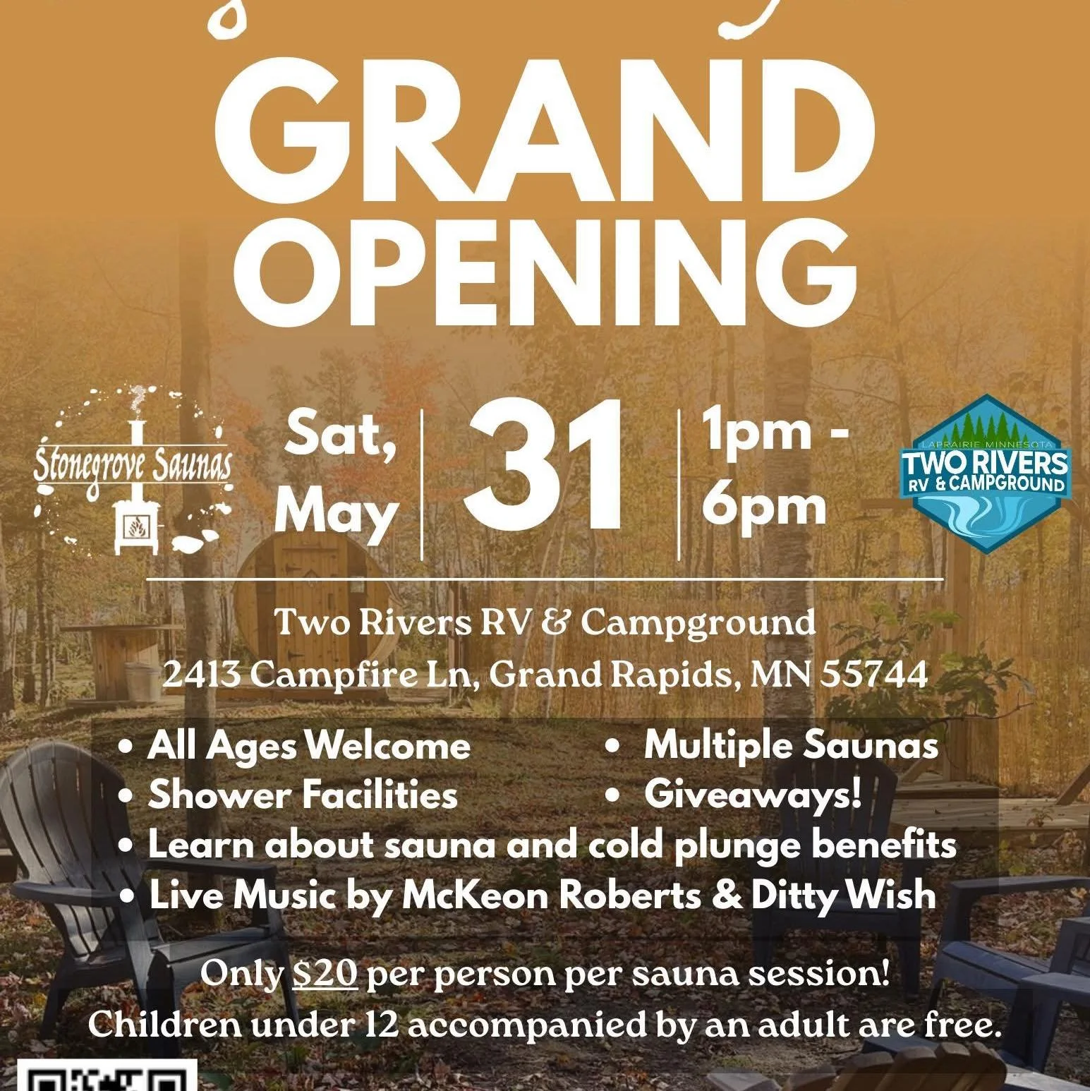 Back to All Events Stonegrove Community Sauna Grand Opening Saturday, May 31, 2025 2:00 PM 3:00 PM Two Rivers RV and Campground 2413 Campfire Lane Grand Rapids, MN, 55744 United States (map) Google Calendar ICS
